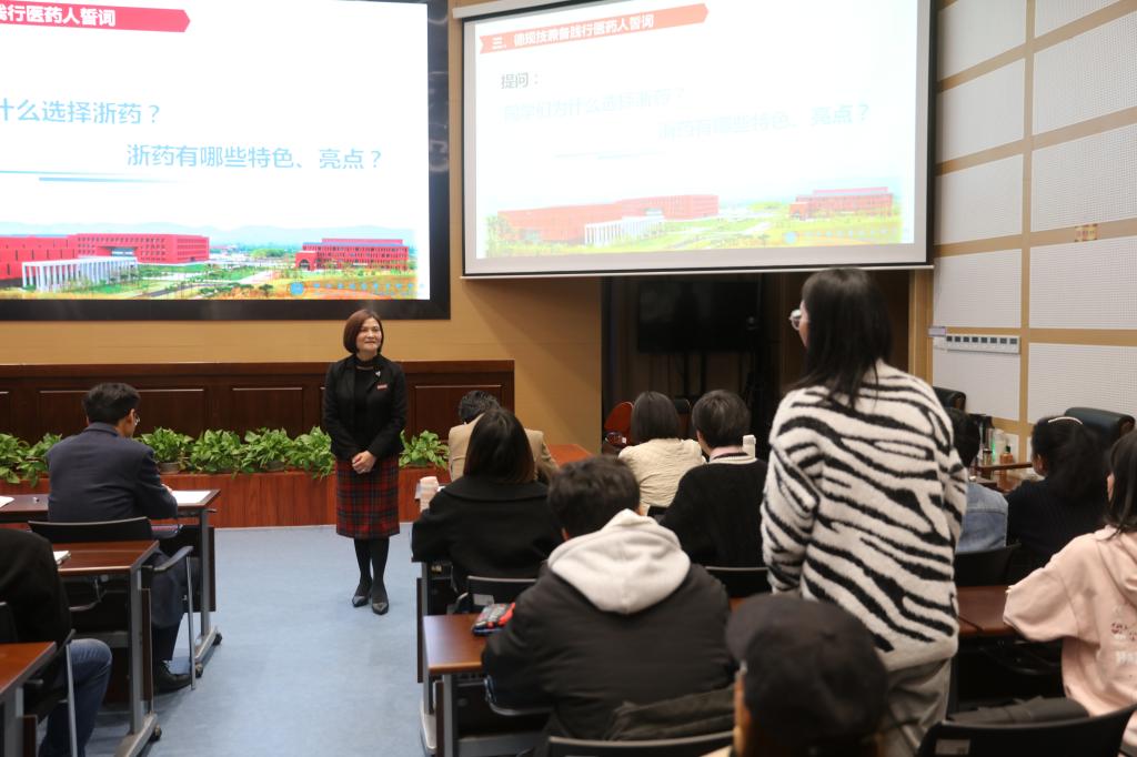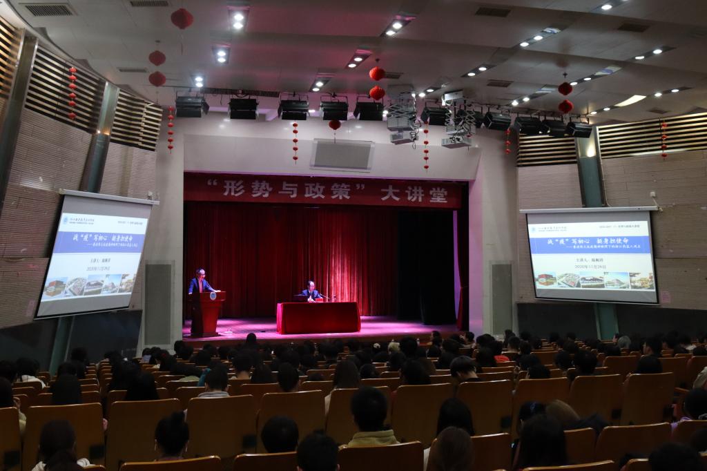 任文霞以“弘扬抗疫精神,勇担使命责任,做德规技兼备的新时代医药人”为题,在奉化校区为中药公司200余名员工以及英国正版365官方网站部分思政教师讲授形势与政策课。在近1个半小时的的课程讲授中,任文霞从伟大抗疫精神的时代内涵、新时代医药人的使命与责任、德规技兼备践行医药人誓词等三方面切入,内容紧扣新时代高素质医药健康事业人才培养、伟大抗疫精神弘扬,倡导广大同学认真践行“医药人誓词”,努力做“德技并修、知行合一、笃志好学、勇担使命”的新时代浙药好学子。任文霞希望广大师生积极秉承“人民至上、生命至上、健康中国”的时代要求,认真践行“厚药德、明药规、强药技”的人才培养理念;高度认同中国制度、中国力量、中国优势;准确理解“新时代浙药学子使命担当”的时代内涵;切实感知为推进健康中国建设、医药强省建设、特色鲜明一流应用型院校建设的主体责任。任文霞勉励广大同学,医药事业是关系人民健康的头等大事,全体浙药学子要积极秉承医药人誓词,认真学好专业基础理论知识,努力培养独立思考和解决问题的能力,积极参与社会实践和志愿服务,全面提升个人综合素质能力。