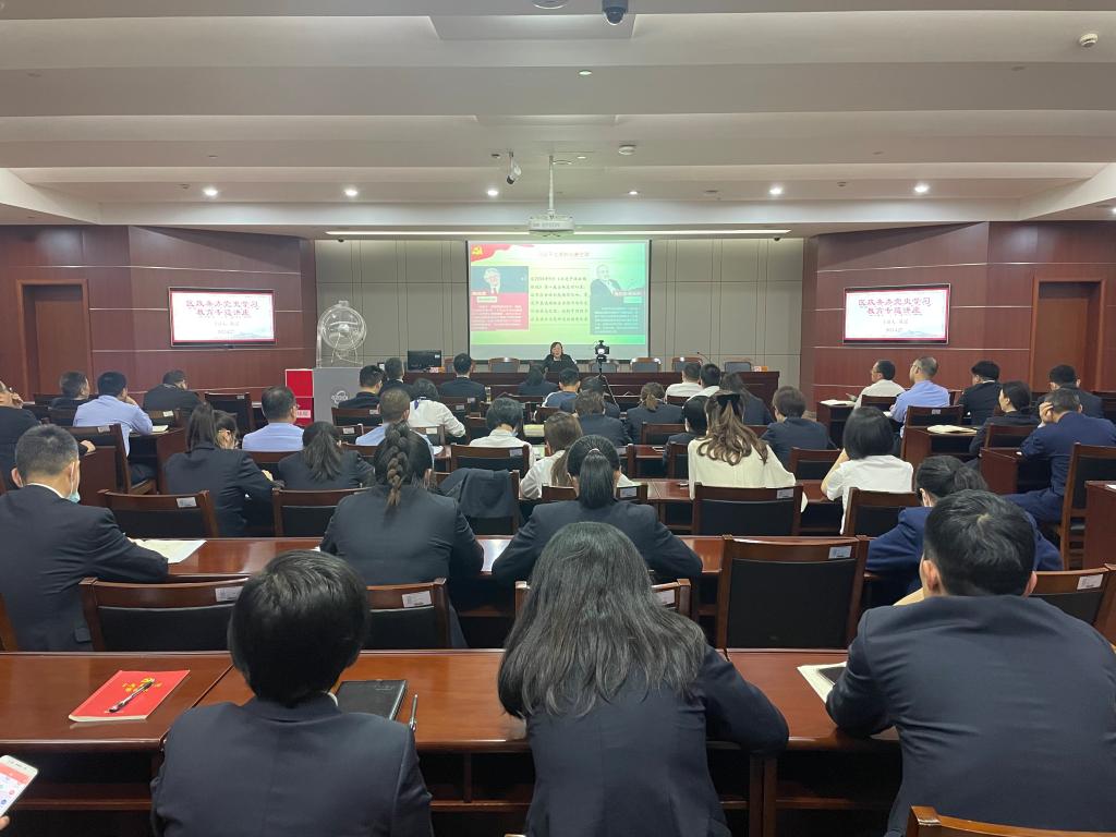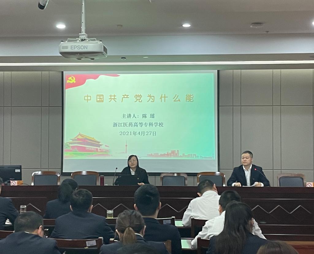 2021年4月27日,英国正版365官方网站思政教师陈瑶应邀赴奉化区行政服务中心开展党史主题教育宣讲,奉化区行政服务中心100余位党员同志参加了宣讲会。