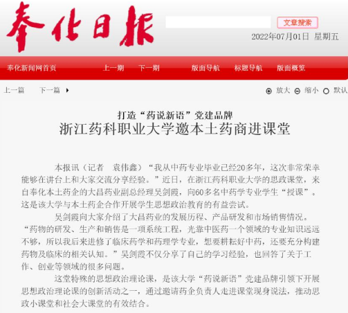 据报道,6月21日,来自奉化本土的大昌药业副总经理吴剑霞女士应公司邀请,给同学们上了一堂题为“药商进课堂 药说富裕经”的特色思想政治理论课。吴经理向同学们介绍了大昌药业的发展历程、企业产品的研发和销售情况,分享在药企工作和学习经验,回答了同学们关于学习、工作、创业等领域的很多问题,让在座的同学们对于所学专业的发展前景有更深入的了解。