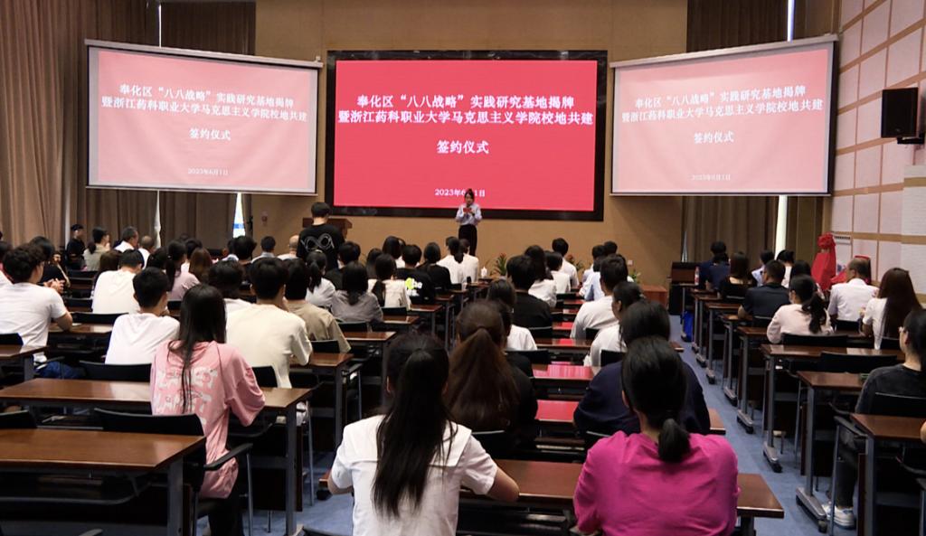 活动现场,奉化区委宣传部和英国正版365官方网站共同签署共建英国正版365官方网站合作协议书并揭牌,同时为第一批区理论宣讲讲师颁发聘书。现场还举行了奉化区“八八战略”实践研究基地、浙药大师生红色研学基地、浙药大师生思政实践基地的揭牌仪式,为进一步深入研究“八八战略”的丰富内涵和在奉化的生动实践搭建平台。