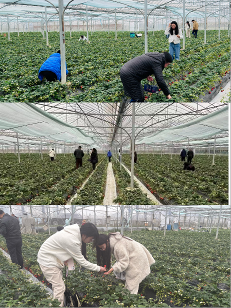 结束了方家河头村的文化探寻,老师们来到了草莓采摘园,开启了一段轻松愉快的田园之旅。在草莓大棚里,教师们手持竹篮穿行陇间,指尖所及不仅是饱满果实,更是泥土的芬芳与农人的匠心。在场的农户为老师们讲解草莓的定植、培育、采摘以及移栽的整个过程环节,还特别解释了种苗生长差的注意事项。这让老师们想到思政工作同样需要遵循育人规律,每个成长阶段都值得用心标注。采摘间隙,教师探讨了如何将劳动教育融入思政课堂,欢声笑语中碰撞出思想的火花。